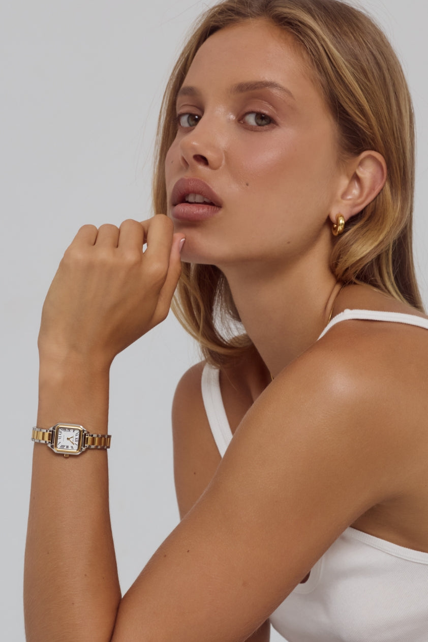Crafted from 18k premium gold plated stainless steel and polished silver stainless steel, featuring a square face, roman numeral dial and an elegant jubilee-style band.