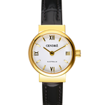 Crafted from 18k premium gold plated stainless steel, featuring a soft round silhouette, roman numeral dial and genuine Italian leather band.