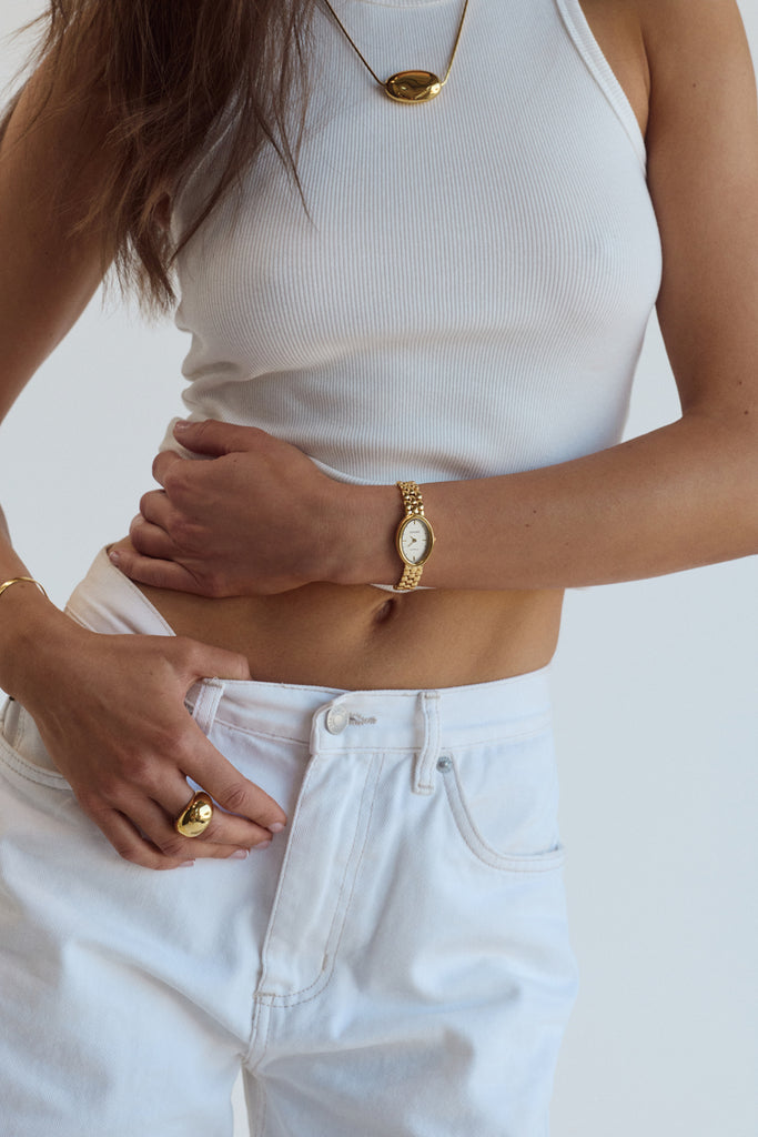 Crafted from 18k premium gold plated stainless steel, featuring an elegant oval watch face, the Phoebe embodies effortless sophistication and timeless appeal.
