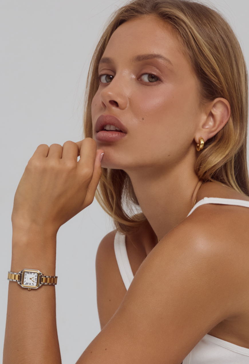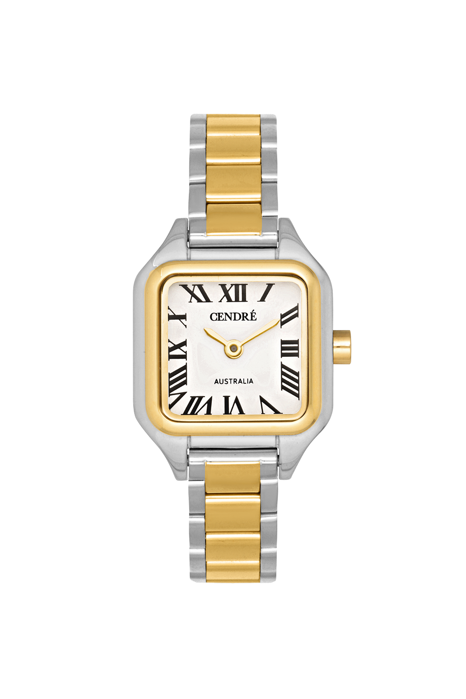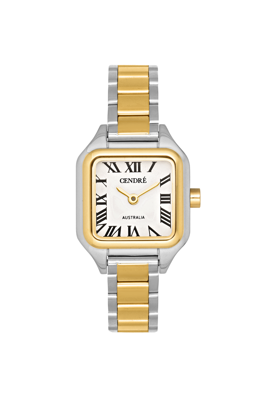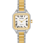 Crafted from 18k premium gold plated stainless steel and polished silver stainless steel, featuring a square face, roman numeral dial and an elegant jubilee-style band.