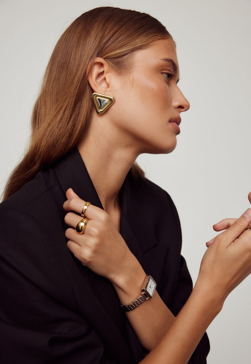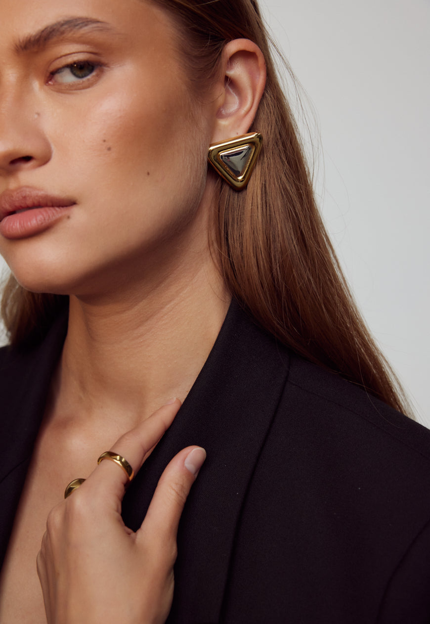 Named after the renowned centre of art in Paris, our Louvre Earrings are destined to be the focal point of your accessories collection. Featuring a distinctive double triangular design crafted from 18k gold-plated stainless steel & Sterling Silver, this two-tone style is set to become a staple in your jewellery rotation.