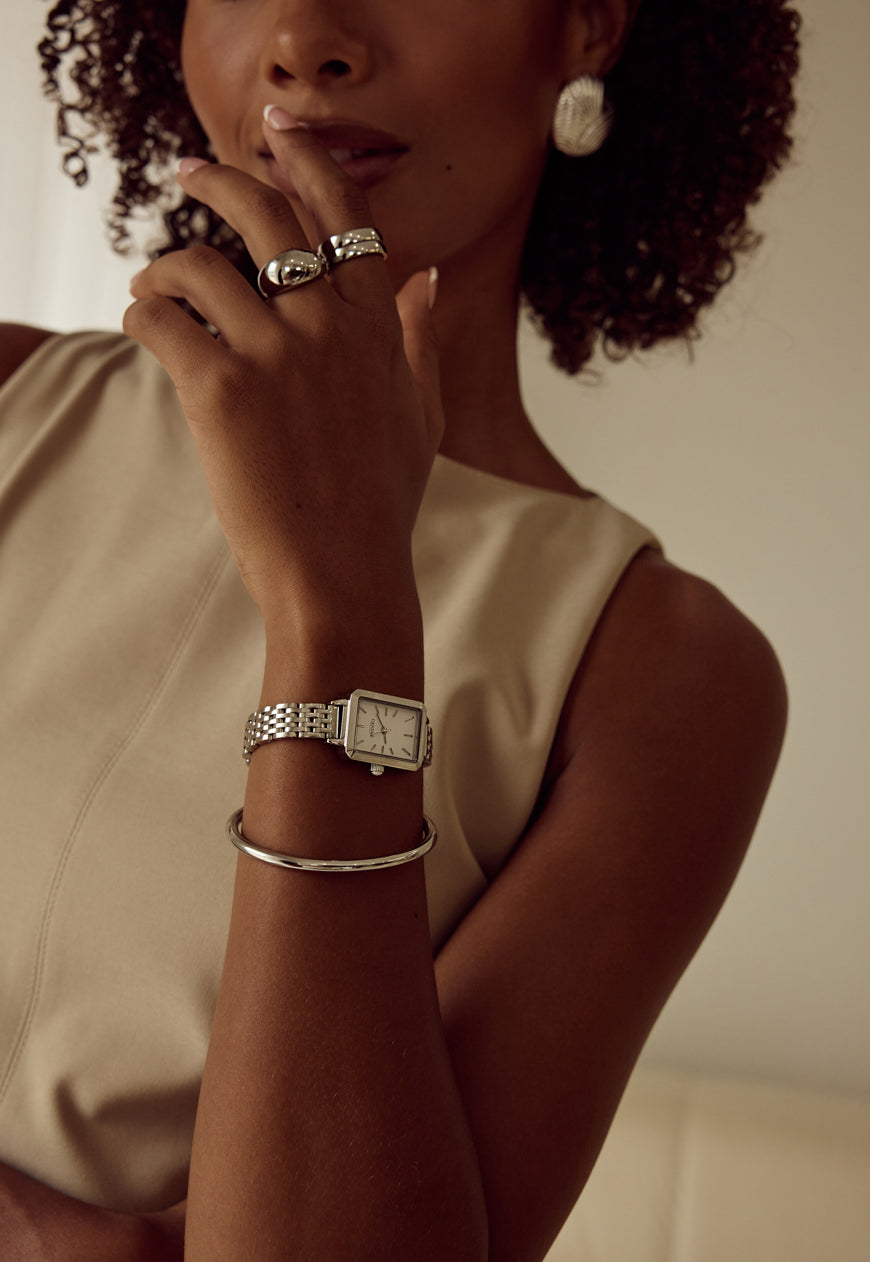 Rich, warm, and softly luminous – our signature gold finish. Designed to make a subtle statement, each piece is plated over high-quality stainless steel for enduring wear.