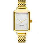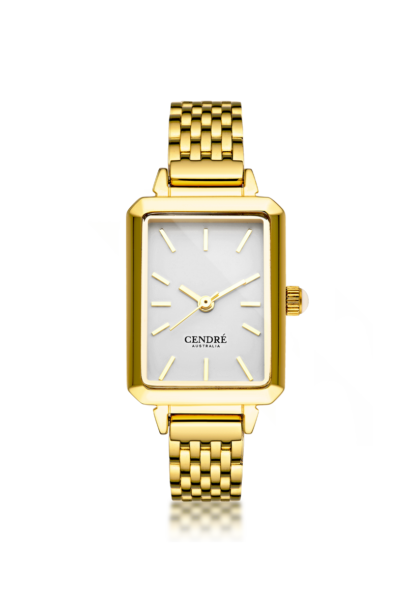 Crafted from 18k premium gold plated stainless steel, featuring a minimalist rectangular white face.