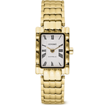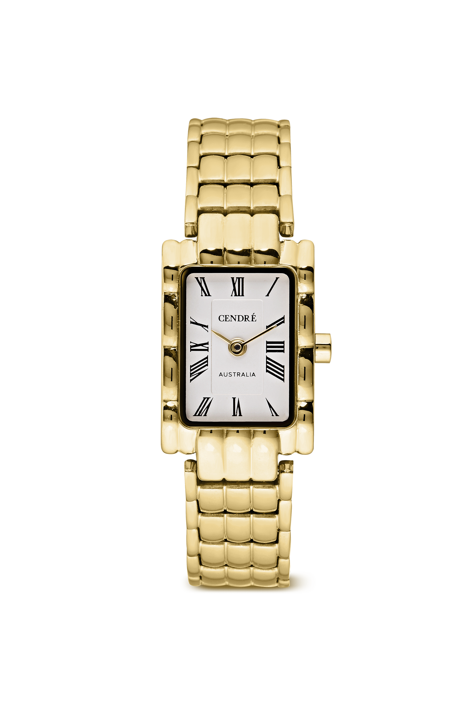 Crafted from 14k premium gold plated stainless steel, featuring a petite rectangular silhouette and roman numeral dial.