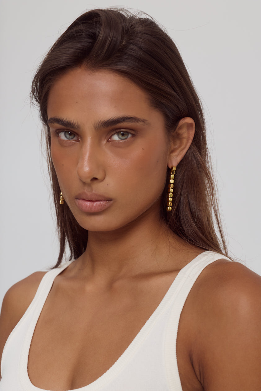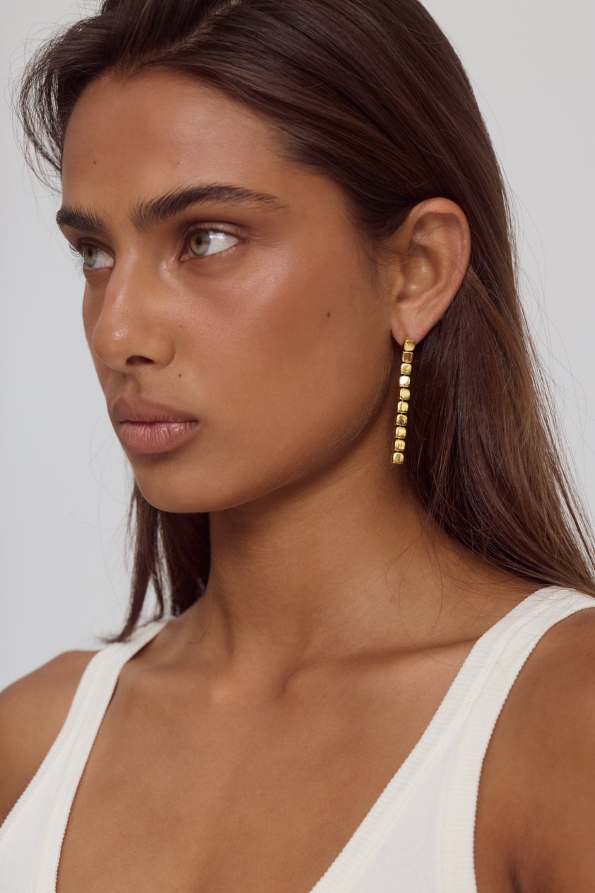 The Rue Earrings feature a sleek vertical drop of rectangular silhouettes, anchored by a minimalist stud. Crafted from 18k Gold-plated stainless steel, their high-shine finish brings a modern edge to everyday styling.